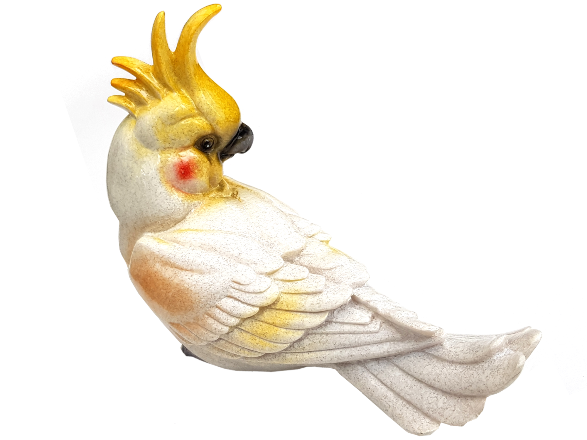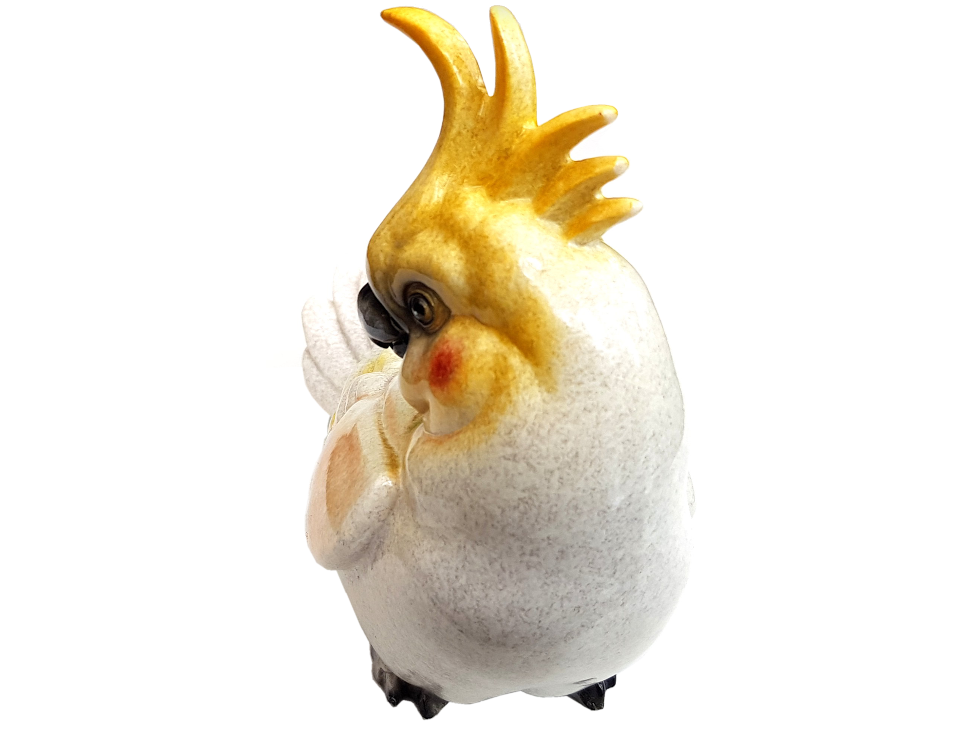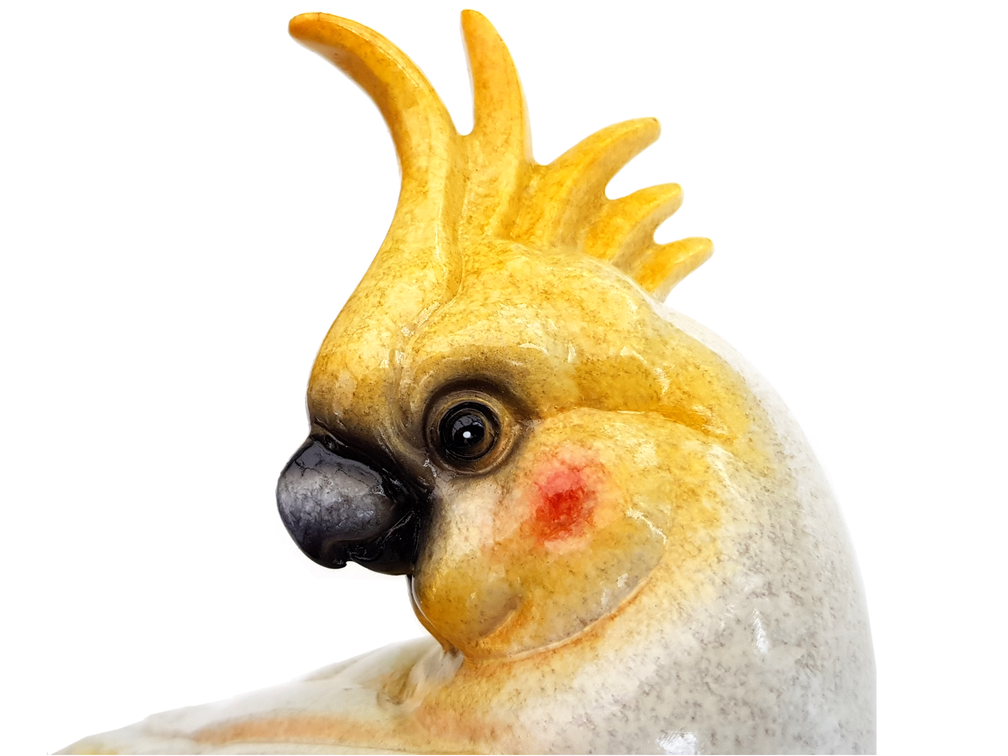 Figurka z porcelitu przedstawiająca siedzącą kakadu żółtoczubą.