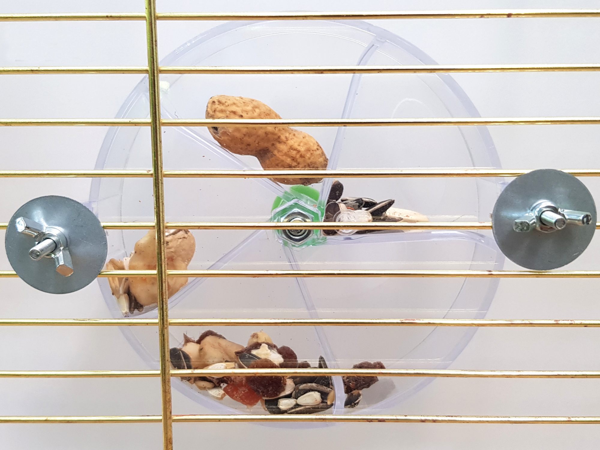 Przezroczyste tworzywo sztuczne pozwala twojemu pupilowi obserwować smakołyk lub przedmiot, który zamkniesz w środku. Mleczna, niecałkowicie przezroczysta ścianka przednia utrudnia nieco zadanie żerowania. Aby wydobyć zamknięte w nim smakołyki lub przedmioty papuga musi kręcić przednią ścianką, aby naprowadzić otwory w niej na komory z jedzeniem. Jedzenie stanie się zabawą, która zabija nudę, skłania do wysiłku umysłowego i fizycznego.