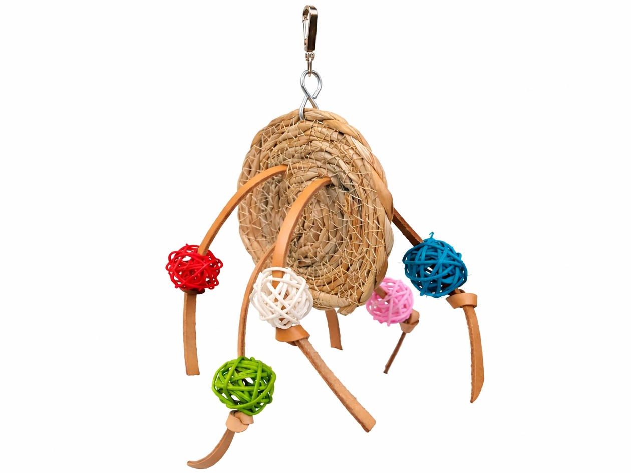 Kulki rattanowe o średnicy ok. 3 cm, umocowane na macie na rzemieniu skórzanym.