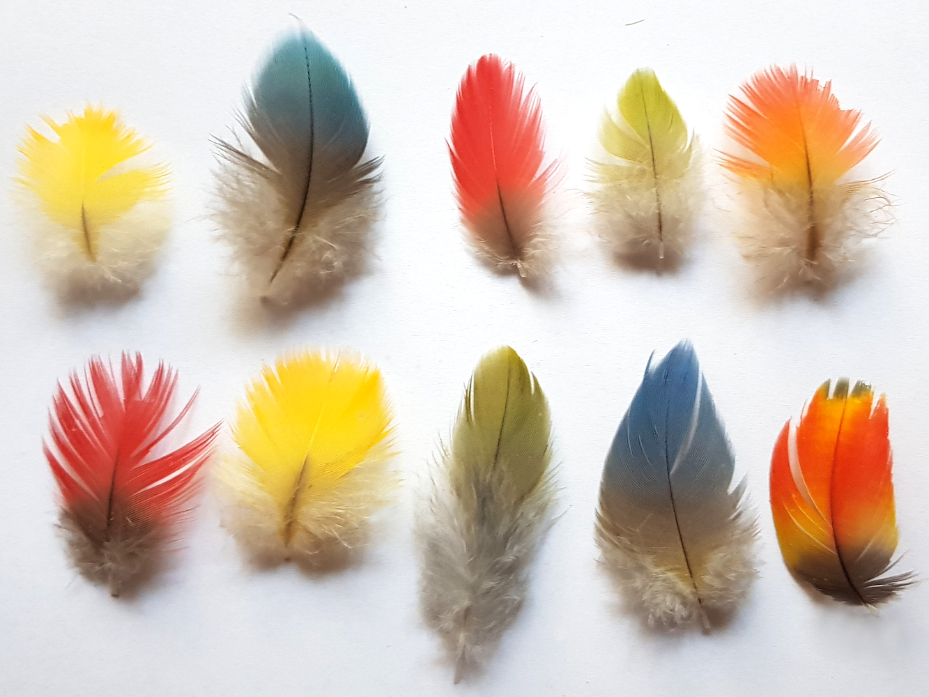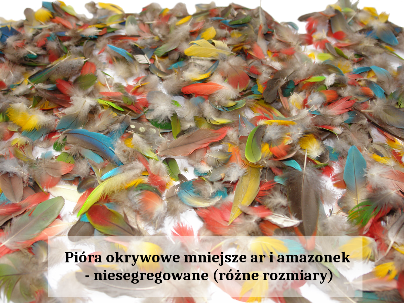 Pióra okrywowe mniejsze ar (zielonoskrzydła, ararauna) i amazonek Długość całkowita w przedziale 5-7 cm Mix kolorów (wysyłane losowo) Zestawy po 10 lub 20 sztuk