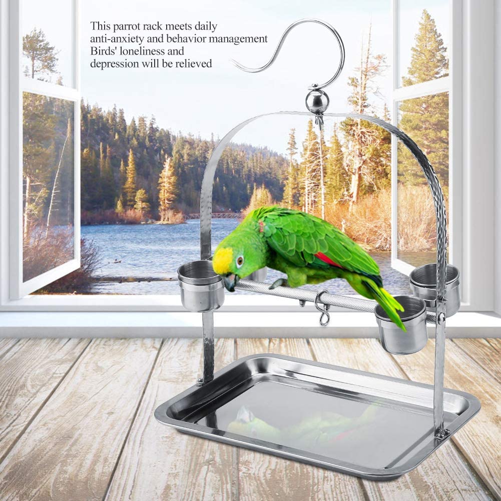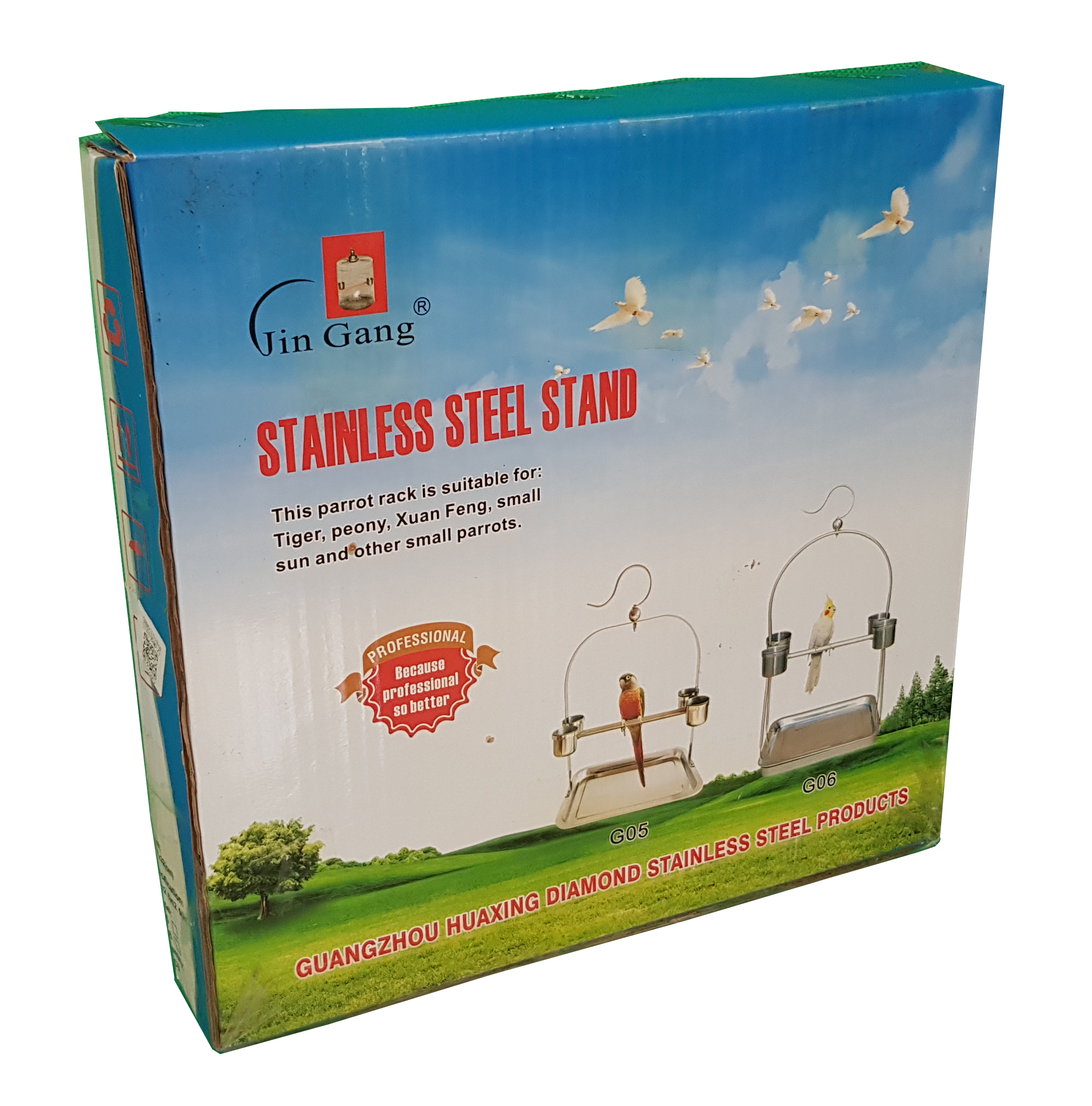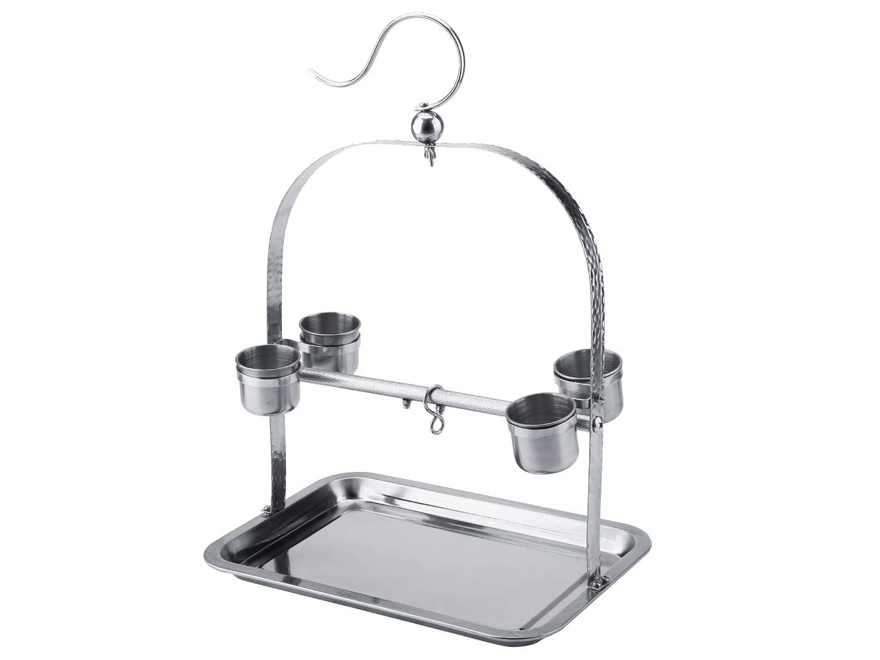 Trwała, niezniszczalna żerdź zawieszana ze stali nierdzewnej z czterema pojemnikami na wodę i pożywienie oraz łatwą do czyszczenia tacką na odchody.